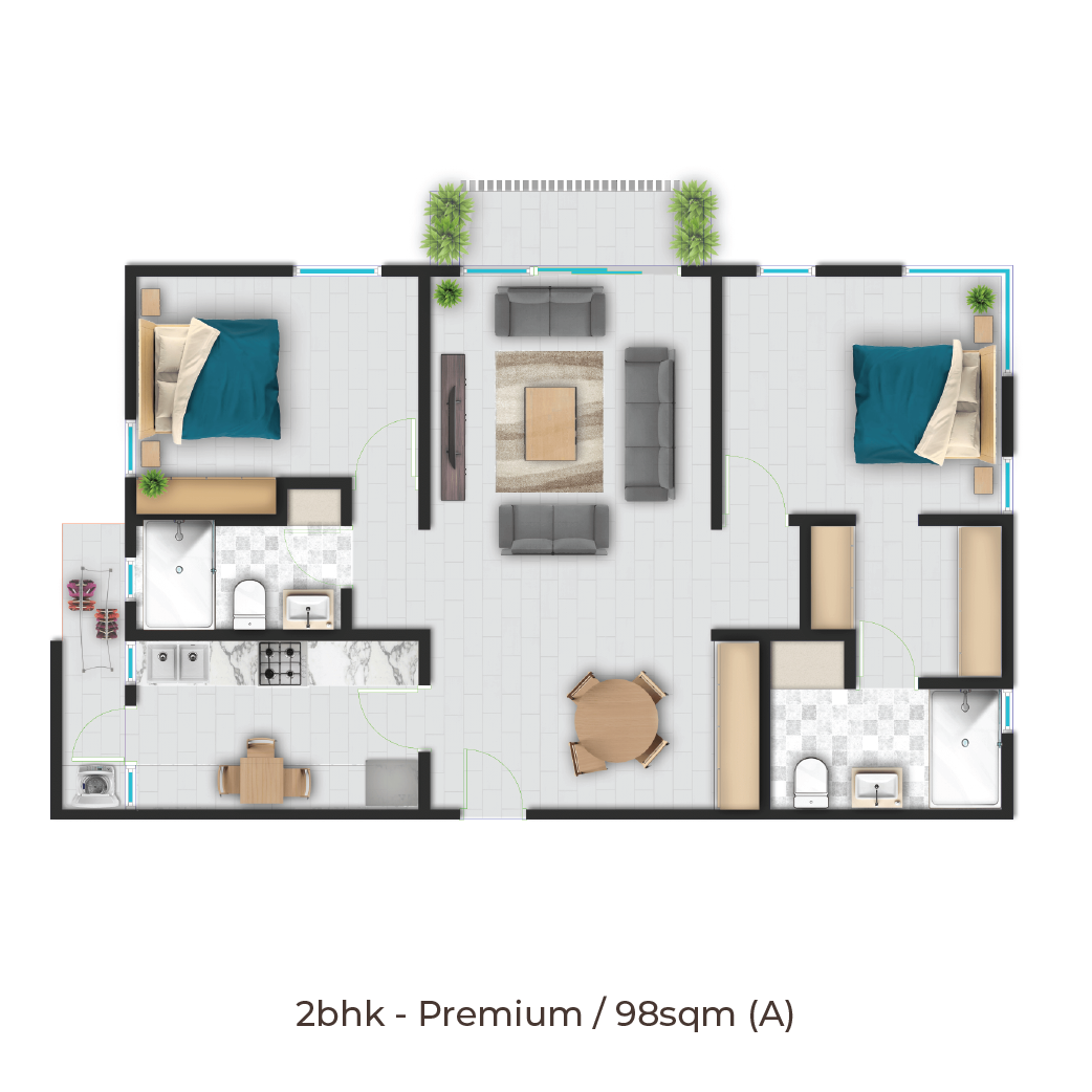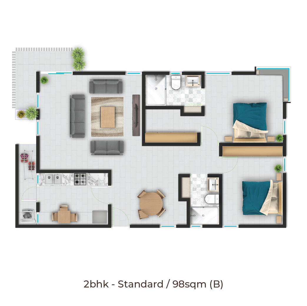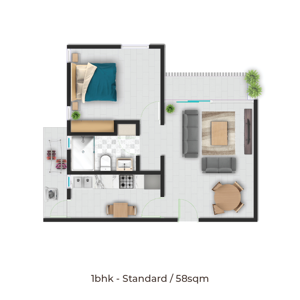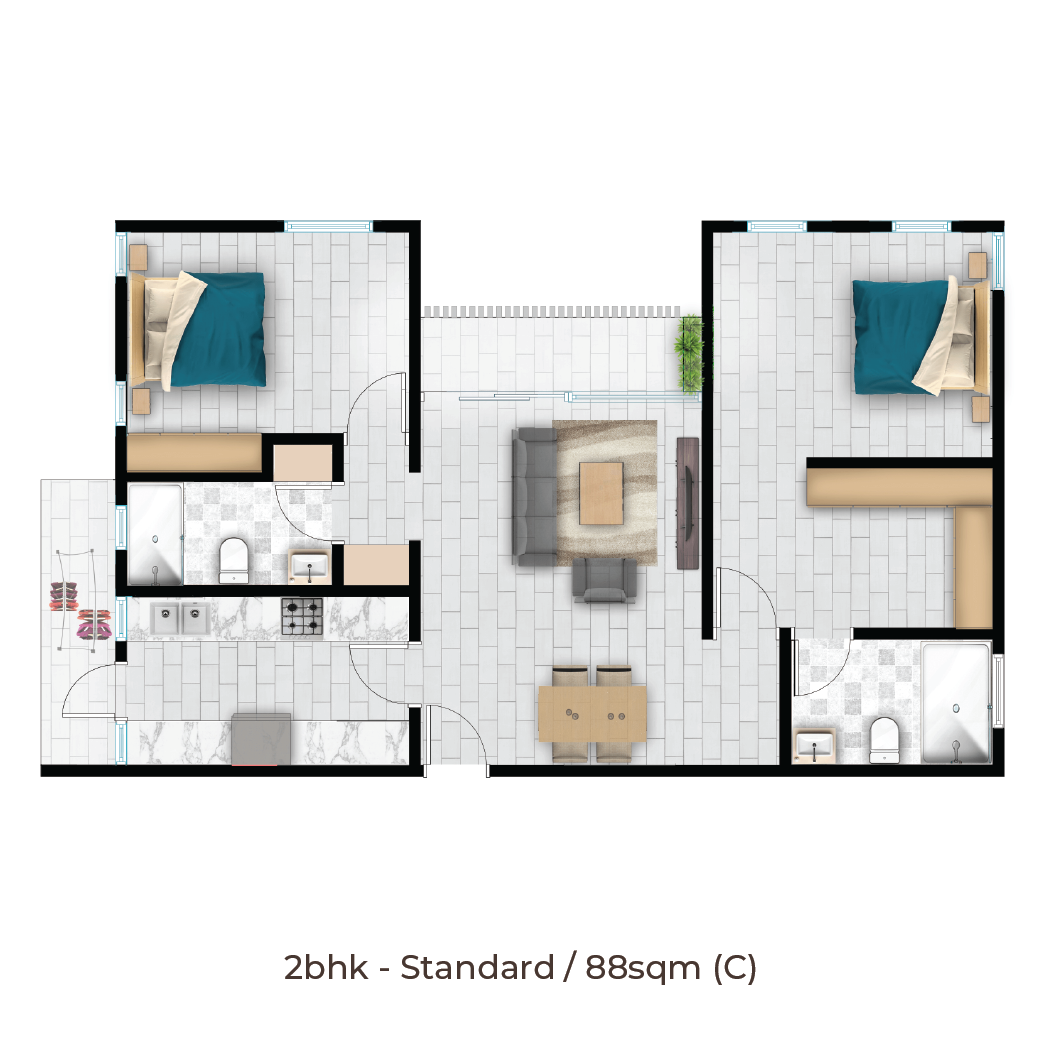 Our apartments are modern purpose-built spaces, comprising of studios, 1 and 2-bedroom apartments ranging from 30 sqm to 100sqm, respectively. These units are efficient on space but lack nothing in the process. The 1 & 2 beds enjoy the closable kitchen concept with an attached utility balcony, cross ventilation in bedrooms as well as balconies with planters to create your own mini-garden.